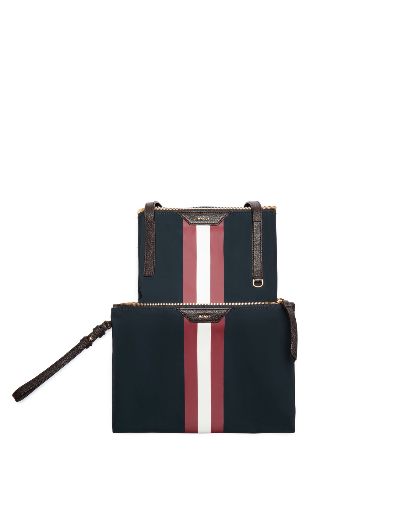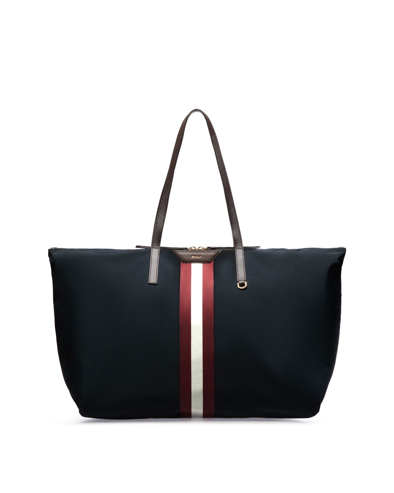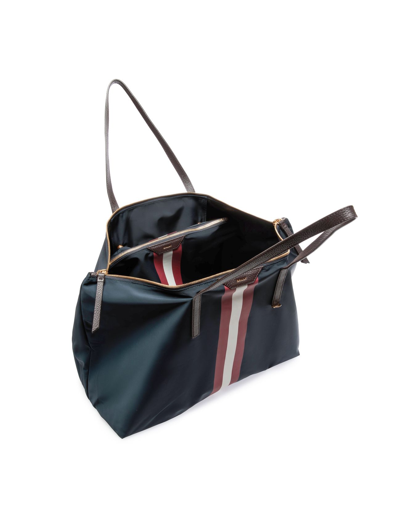 The Hero Bally Foldable Tote comes refreshed with the iconic red and white ribbon to underline the Brand legacy. A unisex malleable style, it is a lightweight option made from a techno, easy-to-clean recycled nylon fabric. This style in Midnight Blue features leather top handles, double top zip closure, and the back exterior trolley pass. It can be packed into a discreet pouch when not in use which can also be used as an internal compartment or an additional bag.