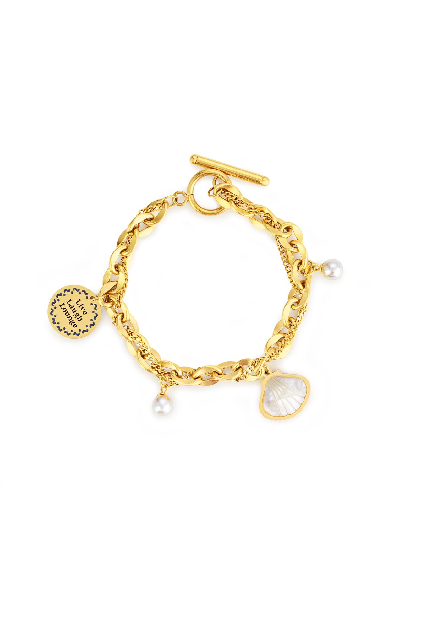 Capture the essence of the ocean with this stainless steel, 18-carat yellow gold-plated charm bracelet. Featuring a T-bar closure, freshwater pearls, playful shells and a coin charm engraved with the words “Live Laugh Lounge”, it is the perfect keepsake to remind you of your sun-soaked adventures.