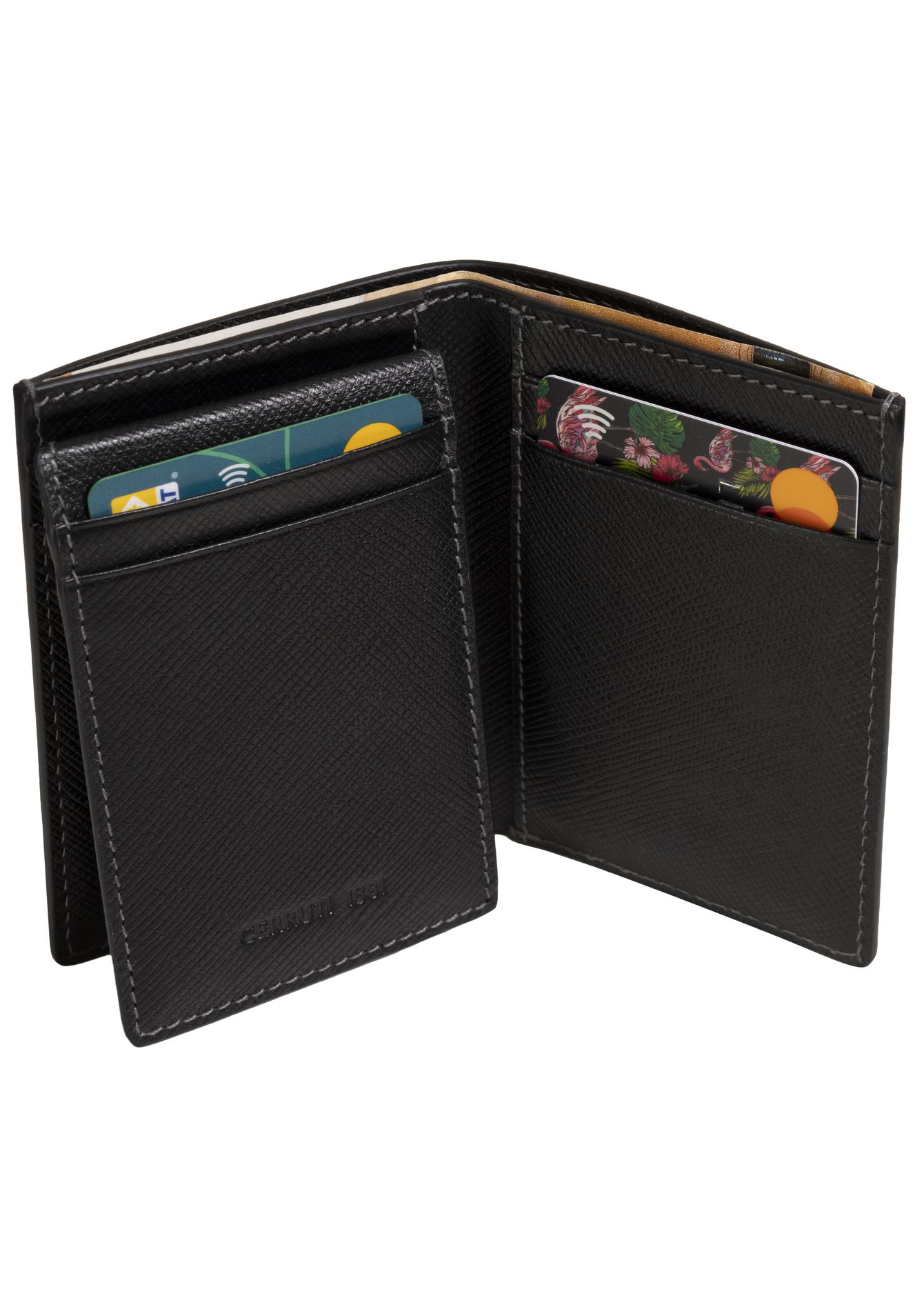 "Saffiano" printed calf leather 8 cc slots, two slide in inner side card slots and vertical paper money compartment. Subtle lettering logo plate.