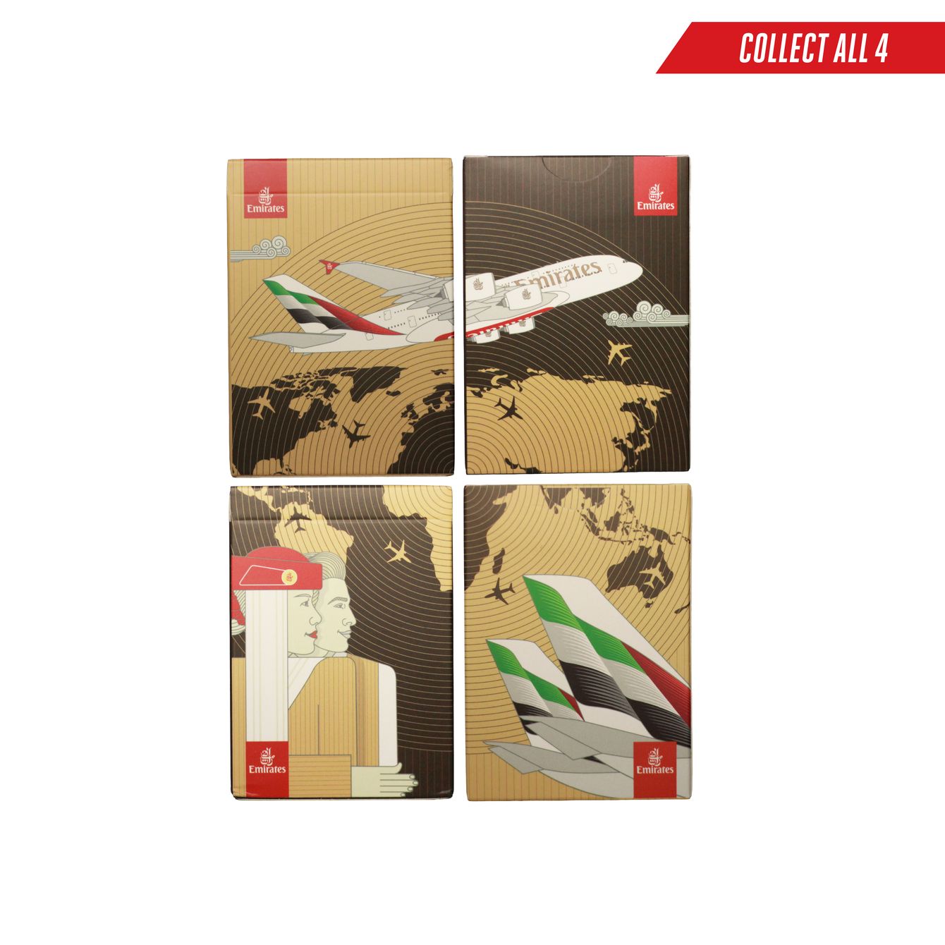 Add flair to game night with our high-quality plastic Emirates-themed playing cards. Our latest editions come with new face card and box designs; collect all four to see Emirates’ fleet and cabin crew take to the skies. It’s the perfect gift to remember each of your flights with us, and a souvenir unlike any other.