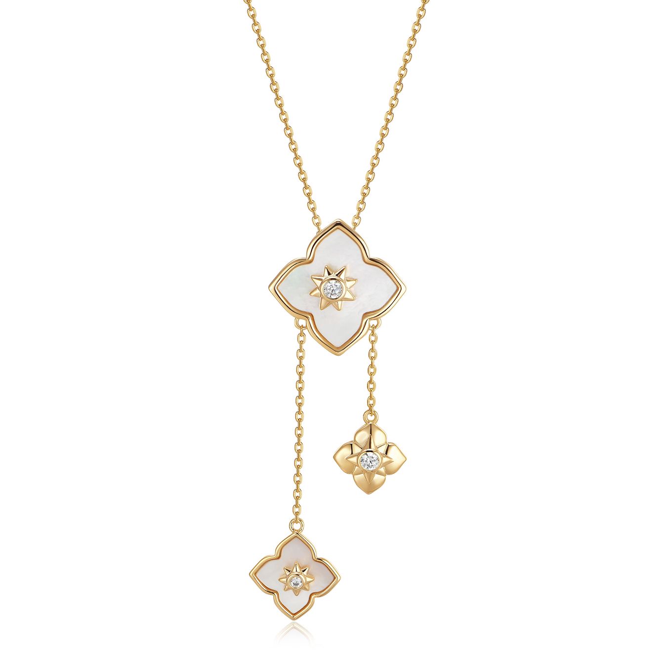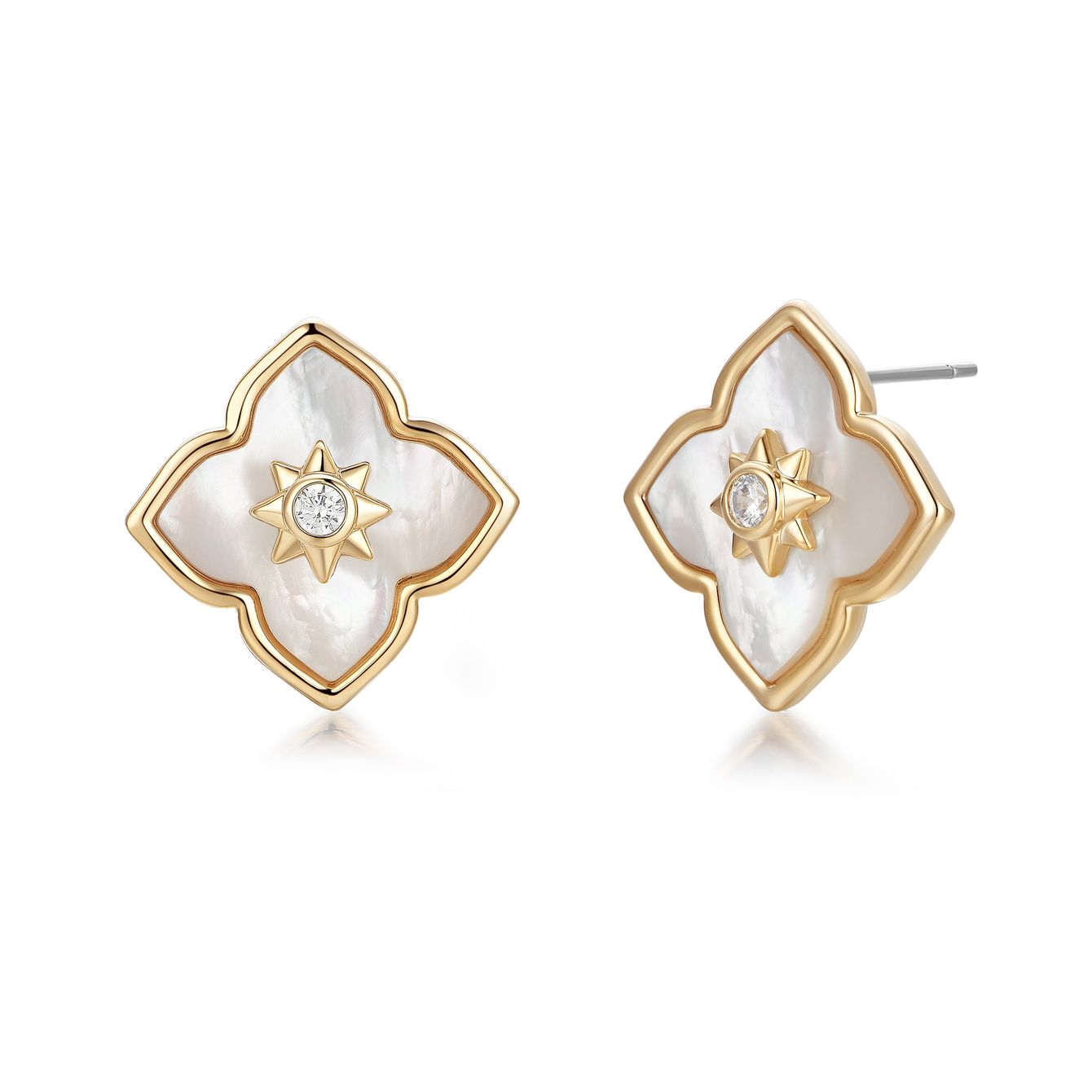 Inspired by traditional Moroccan geometric art, this 18-carat gold-plated jewellery set sees natural mother of pearl delicately cut and carved into the shape of a wild Moroccan flower, while sparkling diamond simulants adorn the heart of each bloom. The necklace (40cm + 5cm extender) and earrings can be worn together for an effortlessly elegant ensemble, or separately for understated charm.