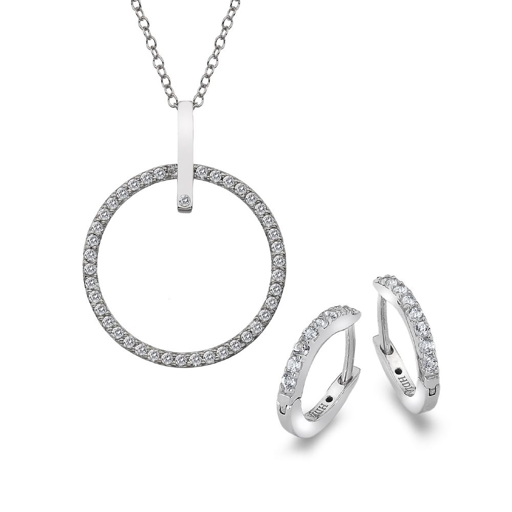 Surround yourself in positivity with the Constant pendant and earring set. This delightfully delicate 25mm circle sterling silver pendant & chain can be worn at either 40cm of slightly longer at 45cm and comes with matching earrings at 13mm x 10mm, all pieces are set with a genuine diamond and are adorned with precious white topaz to complete the glamourous look.