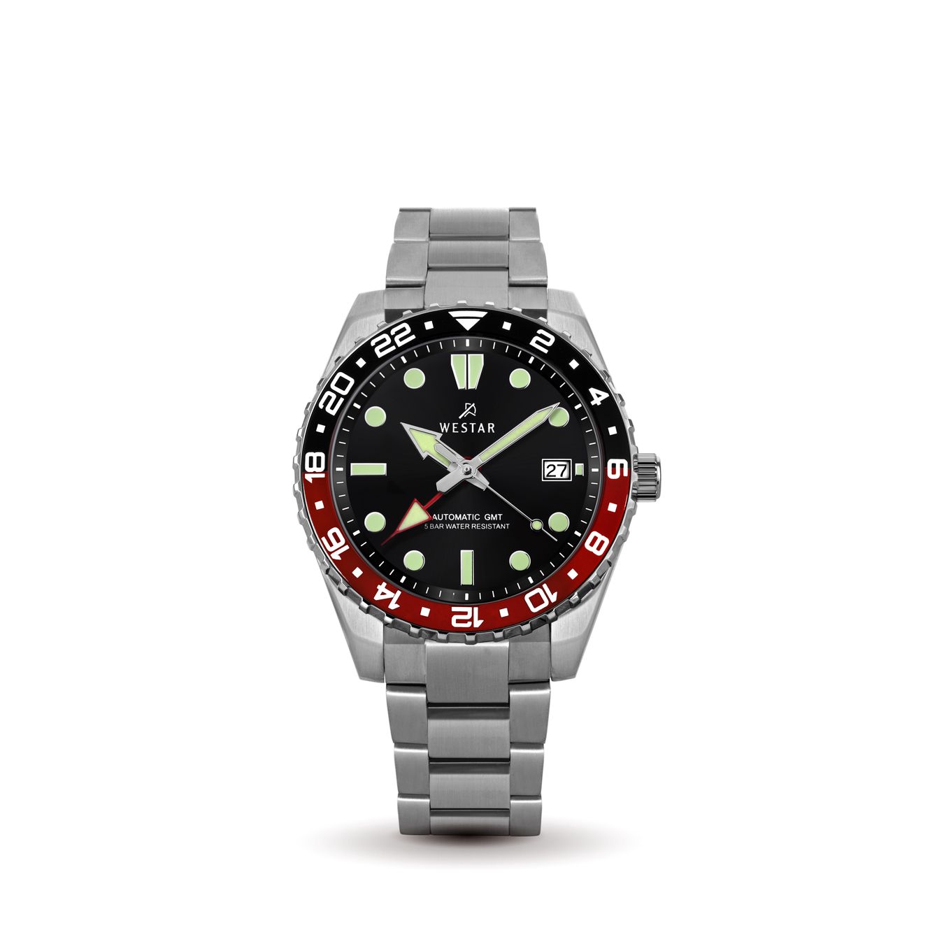 The Westar Automatic Red Black Gents Watch is a sophisticated timepiece crafted for the discerning gentleman who values both style and precision. Encased in durable stainless steel, this watch features a classic round 40mm case that seamlessly integrates with a matching stainless steel bracelet, ensuring both comfort and elegance. Powered by Seiko's reliable NH34 automatic movement with manual winding capability, this watch offers a power reserve of approximately 41 hours, delivering consistent and accurate timekeeping. The dial presents a 24-hour GMT function alongside a date display, making it perfect for those who appreciate practicality and versatility in their everyday wear. With 24 jewels and a smooth beat rate of 21,600 vibrations per hour (6 beats per second), the movement guarantees precision and durability. The watch is water-resistant up to 5 ATM, allowing it to withstand everyday splashes and brief immersions, making it suitable for both professional and casual settings. Finished with a 2-year international warranty, the Westar Automatic Red Black Gents Watch is a reliable companion that blends timeless design with modern watchmaking excellence.